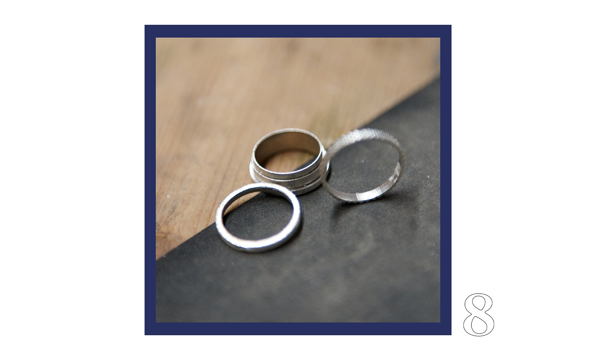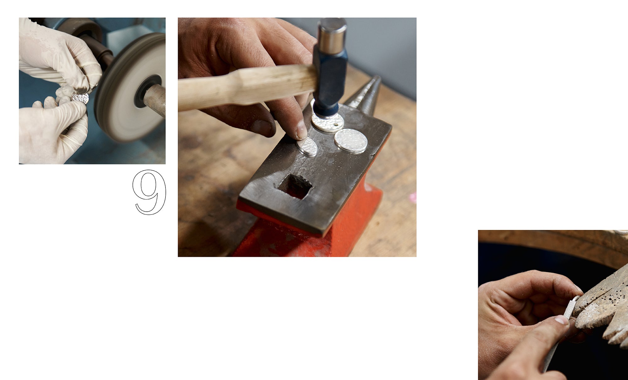 This is one of the final stages of the jewellery making process where surface textures are added to the product. Various grades of mops are used to give either a polished or brushed finish. To achieve the dappled surface on the Oval Pendant, Disc Pendant and Hex Ring, each product is individually hand planished using a special hammer and anvil.