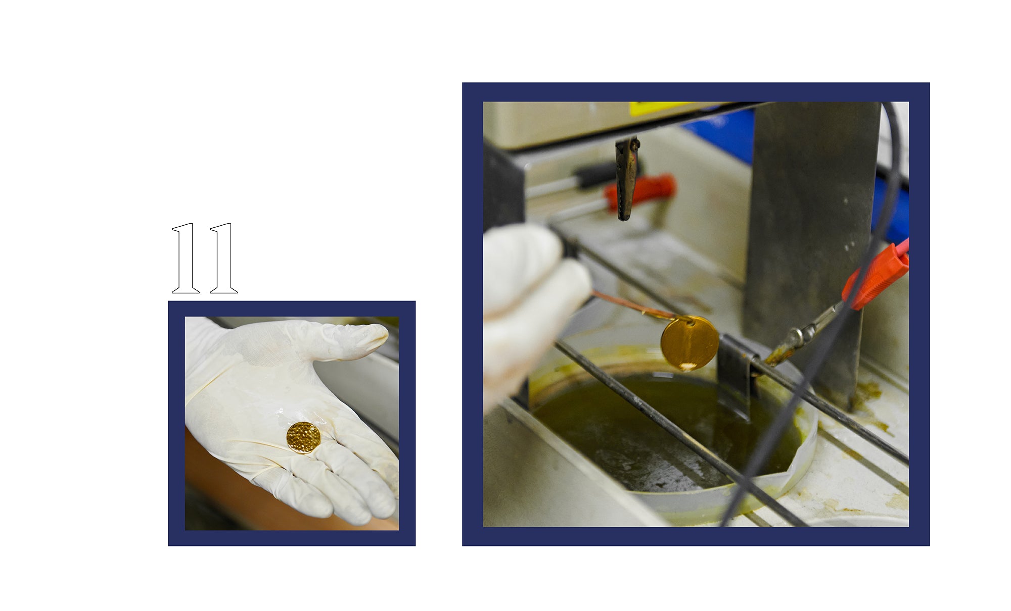 The penultimate stage of the process is the plating. Each sterling silver product is electroplated in either 22kt Gold, Rhodium (silver in colour) or Black Rhodium.