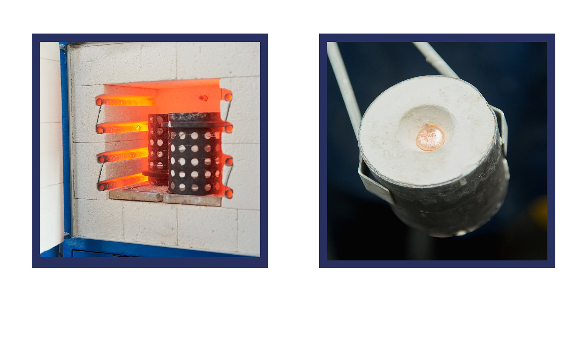 The plaster mould is heated to over 700°C which results in the wax melting and evaporating completely, leaving a negative impression of the pattern cluster. This negative space is then filled with molten Sterling Silver at a temperature of 1040°C, using a vacuum injection method. Once the space has been filled and left to set briefly, the entire plaster cast is submerged in cold water which causes the plaster casing to disintegrate, leave behind the solidified metal cast.